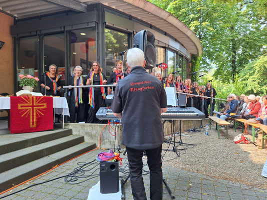 Kurz vor 11 Uhr begrüßten die Vorstandsmitglieder der Arbeitsgemeinschaft Christlicher Kirchen (ACK) Neuwied, Petra Schunkert und Christoph Huss, die Anwesenden und stimmten auf den Gottesdienst ein. Musikalisch gestaltet wurde der Pfingstgottesdienst von der ökumenischen Bläsergruppe unter der Leitung von Jörg Rasbach und dem großartigen Gospelchor Klangfarben. Er wurde geleitet von Petra Zupp, der Schwester von Pfarrer i.R. Werner Zupp, dem viel zu früh verstorbenen, langjährigen Vorstandsmitglied der ACK- mehrmals wurde im Gottesdienst an ihn erinnert.